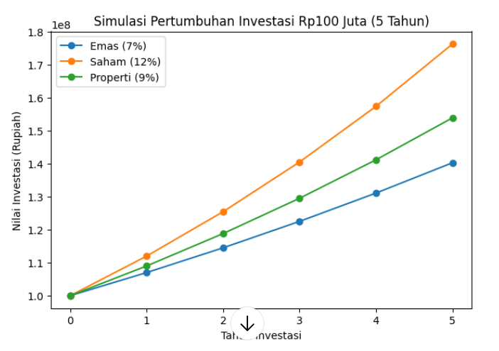 Dari simulasi tersebut terlihat bahwa saham memiliki potensi keuntungan paling tinggi. Namun, risiko fluktuasi harga juga lebih besar dibandingkan emas dan properti.